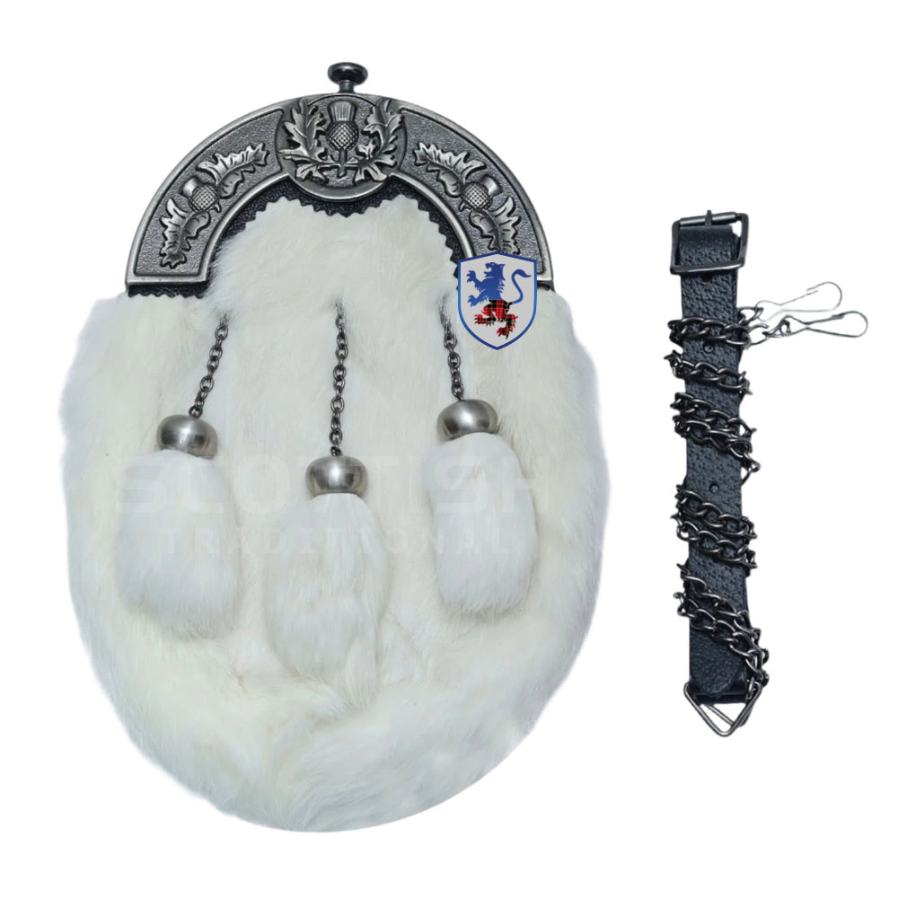 Antique Scottish Flower Cantle With White Fur Sporran three Tassels with belt and chain.