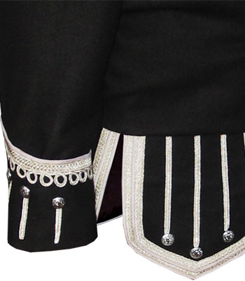 Black Pipe Band Doublet (Black Melton Wool with Silver Scroll Trim + 18 button zip front )