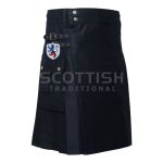 Modern Black Utility Kilt A Stylish Fusion of Function and Fashion comes with Two Antique Brass Buckles and Straps and adjustable brass snaps for adjustment, 2 side pockets and one back pocket brass metal parts This Kilt is ideal for Sporting Events, Parties, and simply Fashion wear. All our casual kilts come with a regular length of 24”